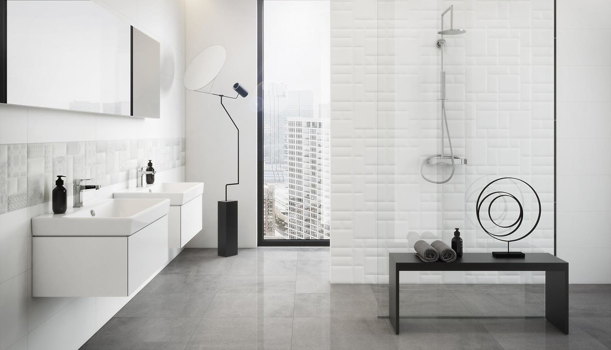 Smooth base tiles, flooring in shades of grey, oak-inspired porcelain tiles and two original “quilted” wall decorations – these are the elements, with the use of which anyone can create their own stylish interior. A great idea for minimalist, romantic or Scandinavian bathrooms.