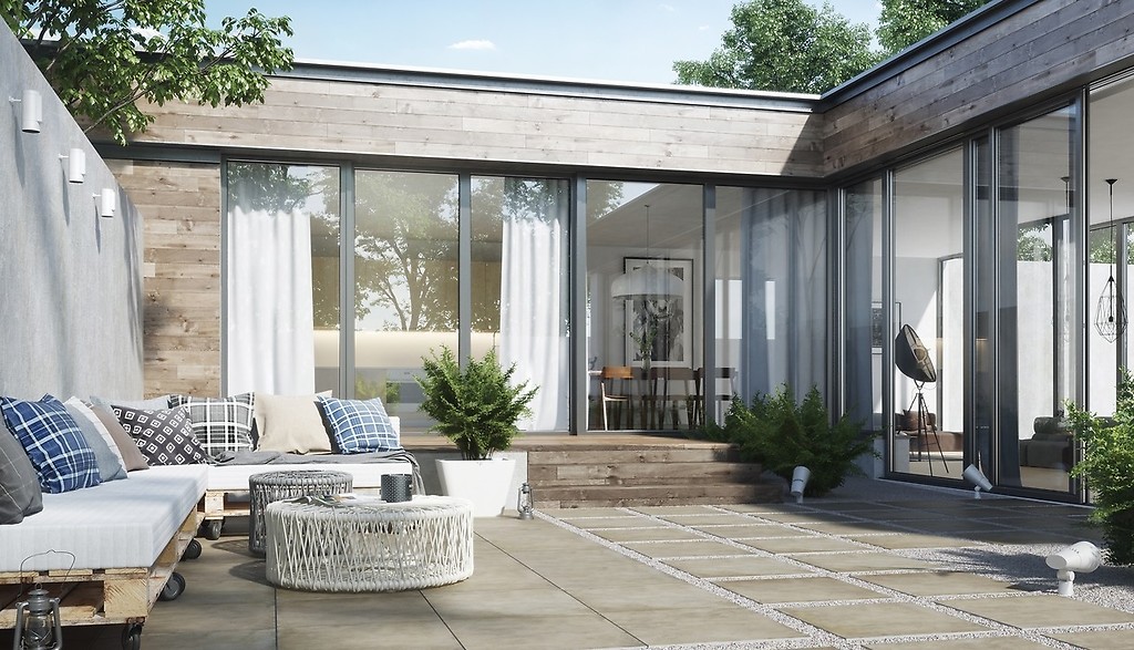 Treat your patio like a place where you spend your free time, and in designing it, let your imagination run wild. Think about comfortable garden furniture, resembling living room sofas. Soft cushions and a place to lie down are definitely conducive to relaxation. They will create the atmosphere of warmth and comfort that is usually associated with the living room. You also have to pick the colours. White furniture can get dirty quickly. Any shades of grey or wooden elements are excellent as they will mask any damp patches caused by rain. The additional advantage of such colours is that they never go out of style.